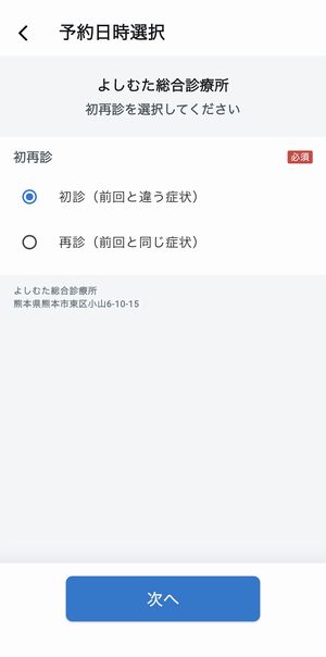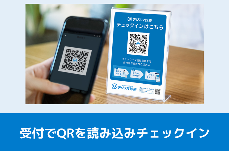 来所したら、デジスマ診察券アプリで受付にあるQRコードを読み取り、初再診、支払い方法を選択して、「チェックイン」をタップします。