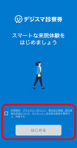 「次へ」を押し進め、利用規約等を確認、チェックを入れて「はじめる」を押します。
