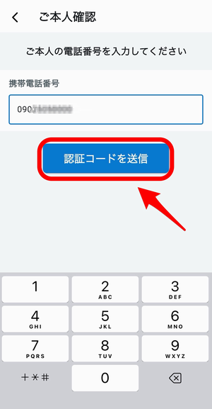 「電話番号」を入力し、「認証コードを送信」ボタンを押します。